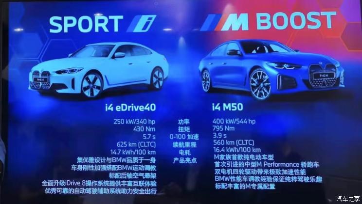 动力系统部分,i4 eDrive40为单电机,最大功率为250kW(340马力),峰值扭矩为420牛·米,其0-100km/h加速时间为5.7秒,在CLTC标准下续航里程可达625公里;i4 M50所搭载双电机的最大功率为400kW(544马力),峰值扭矩为795牛·米,其0-100km/h加速时间为3.9秒,CLTC标准下车辆续航里程最高为560公里。